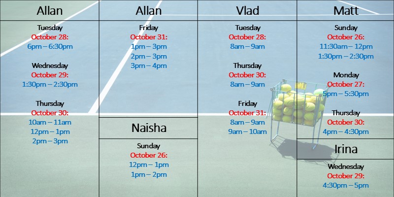 To book a lesson or hitting partner, please send us an email & submit your preference for day & time from the options available below: play@camperdowntennis.com.au